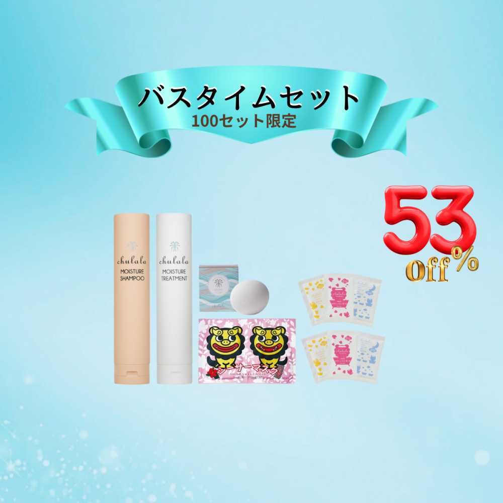 【セット内容】モイスチャーシャンプー 250mL、モイスチャートリートメント 250g、ハーバルソープ 波 80g、シーサーマスク 各1個。沖縄アロマバス3種セット 2個